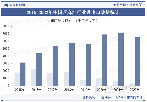本文节选自华经财产研究院发布的《2023年中国芝麻油行业分类、产量、进出口商业及成长趋向阐发「图」》,如需获取全文内容,可进入华经谍报网搜刮查看。目前,我国芝麻油行业以出口为从,出口数量大于进口数量。按照中国海关总署数据,2022年全年累计出口芝麻油产物6552吨,较2021年削减648吨,进口数量也有所削减,为310吨,较2021年削减404吨。