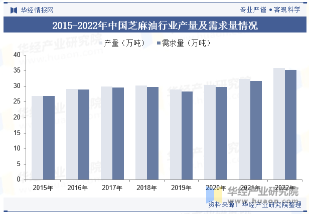芝麻油具有奇特的风味且养分价值较高,是汗青长久的食用动物油品种之一,深受人们喜爱。数据显示,2015至2022年,我国芝麻油行业产量由26。93万吨增加至35。9万吨,期间复合年增加率为4。19%;我国芝麻油需求量由26。8万吨增加至35。27万吨,期间复合年增加率为4%。