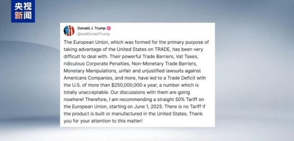 本地时间5月23日,美国总统特朗普正在社交上暗示,自6月1日起对欧盟征收50%的关税。